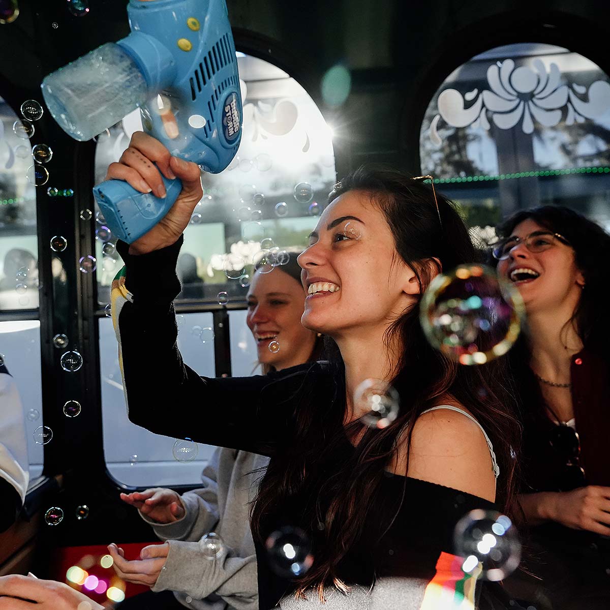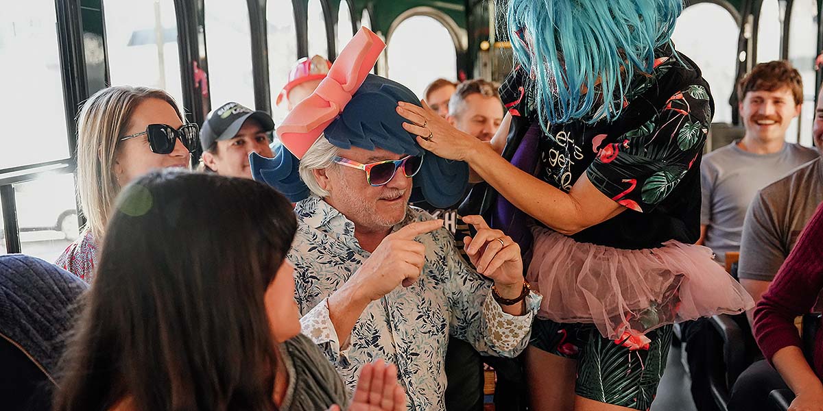 Nashville for Morons host interacting with guest inside trolley